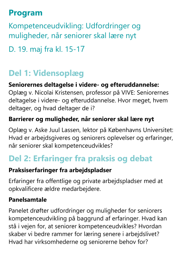 Vi har behov for viden om seniorers eget syn på kompetenceudvikling, og hvordan indsatser kan blive udformet, så de appellerer mest muligt til seniorerne. Derfor sætter Videnscenter for Seniorer på Arbejdsmarkedet fokus på seniorers kompetenceudvikling med dette gå hjem-møde. Vi kortlægger seniorernes deltagelse i efteruddannelse og ser på de udfordringer og muligheder, der opstår, når seniorer skal lære nyt – gennem vidensoplæg, erfaring fra praksis og panelsamtale.